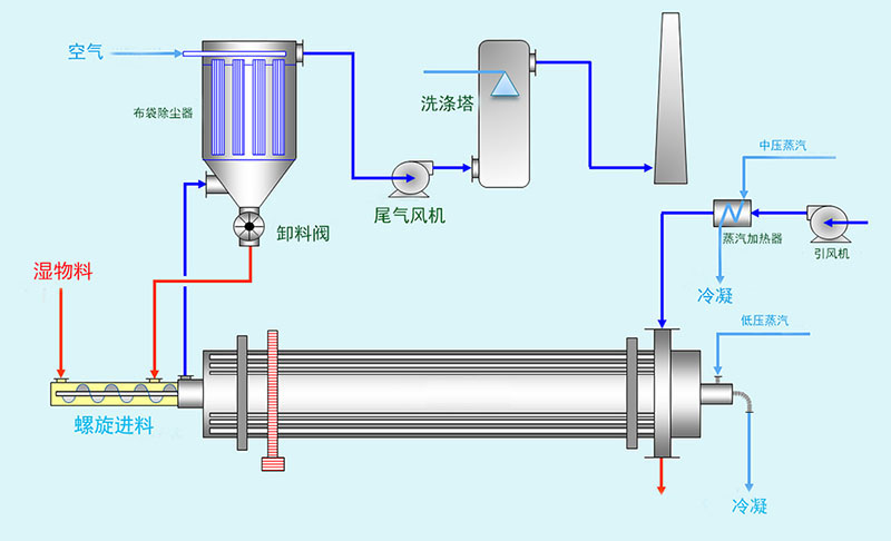 黑米烘干機利用熱傳導和熱輻射原理,蒸汽在管束內與物料呈逆流或順流方式,物料在負壓封閉腔內通過管束上的鏟板攪拌和推動,由進料端向出料端移動,一部分成品物料通過卸料槽到卸料螺旋,經排料關風機排出。另一部分成品物料通過返料關風機到混料螺旋,經輸送攪拌機與濕物料充分攪拌混合,降低原始濕物料的含水量,達到干燥機的理想工作條件。